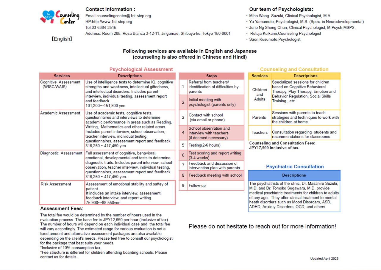 Psychological assessment, psychological counseling, and developmental counseling are available at 1st STEP Counseling Center.